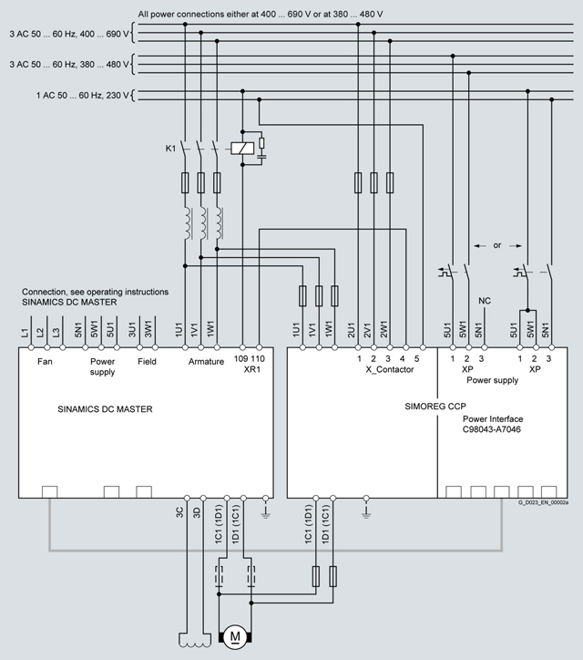 Управляющее напряжение для главного контактора (или выключателя) всегда должно быть направлено через клеммы XR (подключение 109 и 110) от преобразователя SINAMICS DC MASTER, а также через клеммы X_Contactor (соединения 4 и 5) SIMOREG CCP.