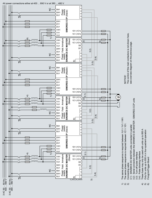 Для приложений с SIMOREG CM, в случае неисправности, конвертер или SIMOREG CCP должны иметь возможность безопасно отключить устройство от сети питания. Кроме того, необходимо обеспечить, чтобы в общей сложности задержка времени всех коммутационные элементов в цепи управления не должны превышать время, установленное с помощью соответствующих параметров. Когда SINAMICS DC MASTER преобразователи подключаются параллельно, каждый непосредственно параллельно связан с SIMOREG CCP (см. блок-схему для параллельного подключения).