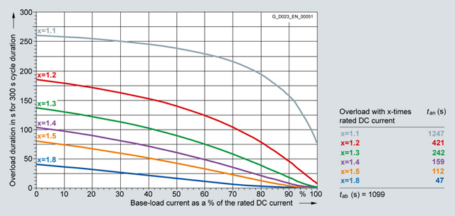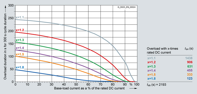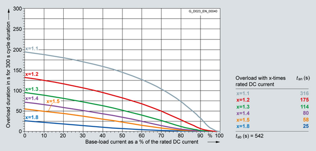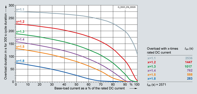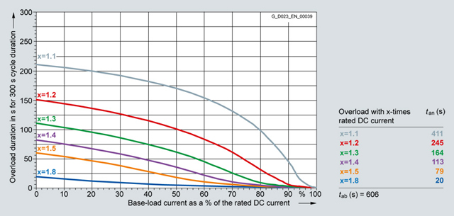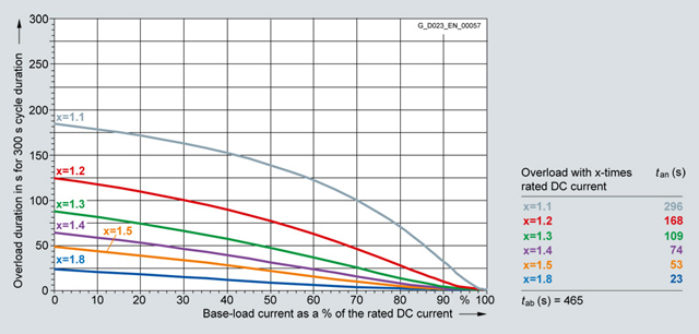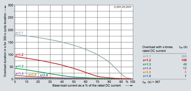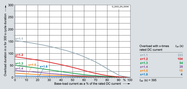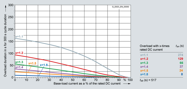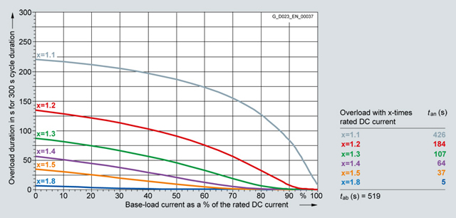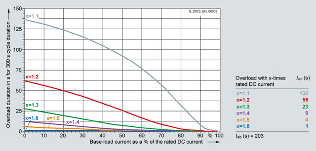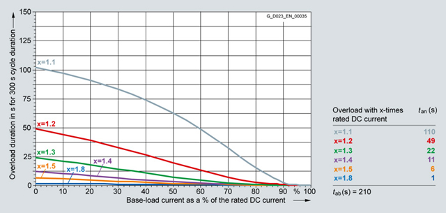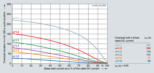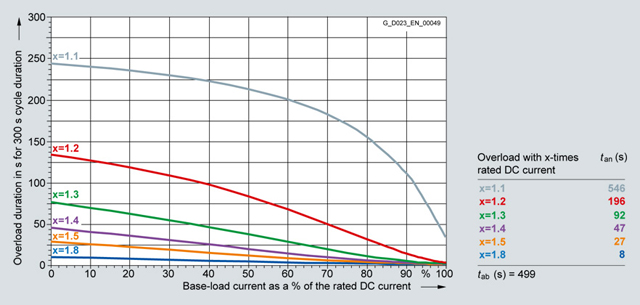 Каждая граничная кривая представляет собой специфичный для преобразователя при соответствующем коэффициенте перегрузки максимальный ток основной нагрузки (граничный ток нагрузки, заданный в % от номинального постоянного тока) в течение минимального времени перегрузки (граничное время перегрузки). Тогда для остаточного времени пика нагрузки допустим максимальный ток, определяемый коэффициентом перегрузки. Если для желаемого коэффициента перегрузки не задана граничная кривая, то следует руководствоваться граничной кривой для следующего коэффициента перегрузки.
