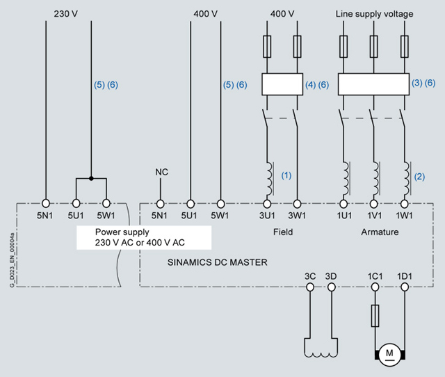(6) Если напряжения питания для цепи якоря, цепи возбуждения и питания электроники одинаковые, то напряжение для возбуждения и блок питания электроники может быть принято после фильтра подавления радиопомех для цепи якоря.