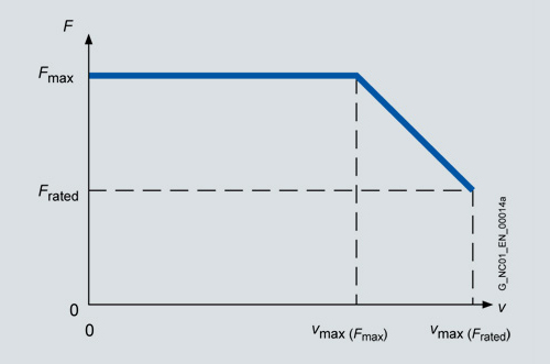 Линейные двигатели 1FN3 имеют диапазон перегрузки, необходимый для процессов ускорения. Максимальное усилие FMAX возможно только до максимальной скорости vMAX(FMAX); до скорости vMAX(Frated), только номинальное усилие подачи Frated возможно.