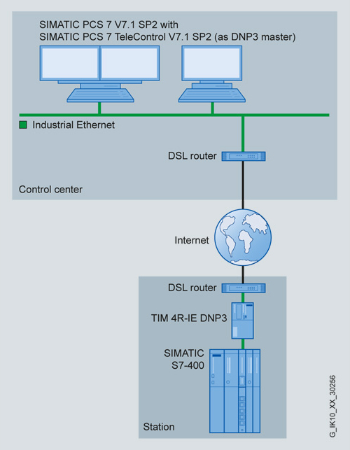 Подключение станции выполнено через Интернет соединение. В этом случае DSL маршрутизаторы должны использоваться и со стороны станции, и со стороны центра управления – предпочтительно в сочетании с модулями SCALANCE S в случае установки защищенных соединений с использованием VPN туннелей.