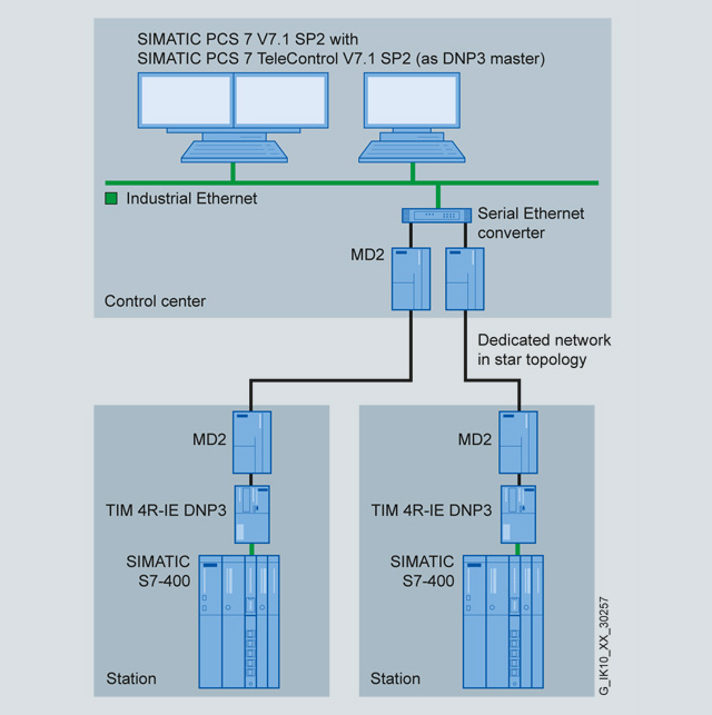 Станция подключается через GSM с поддержкой сервисов GPRS. При использовании на станции GPRS маршрутизатора MD741-1 и модуля SCALANCE S в центре управления появляется возможность установки  VPN соединений между центром управления и GPRS станциями.