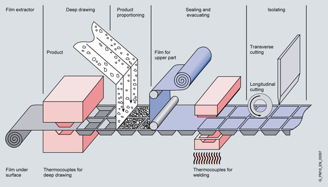 В зависимости от продукта, который нужно упаковывать, пленка формируется в соответствующие ёмкости. Вытяжной инструмент перемещается с различными, зависящими от положения инструмента скоростями и при необходимой температуре нагрева.