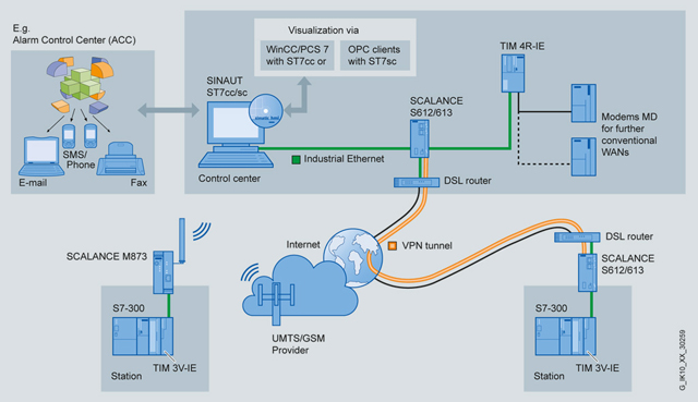 Пример подключения станции S7-300 с модулем TIM 3V-IE и маршрутизатора SCALANCE M873 к центру управления (SINAUT ST7cc или ST7sc) через UMTS и Интернет. За модулем SCALANCE S установлен коммуникационный модуль TIM 4R-IE. Центр управления использует модуль SCALANCE S для SINAUT обмена данными со станциями, подключенными через Интернет, а также со станциями, подключенными к модулю TIM 4R-IE через две другие сети. Маршрутизацию перекрестного трафика между отдельными станциями выполняет модуль TIM 4R-IE.