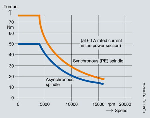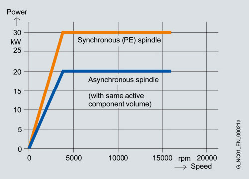 Характеристики мощность-скорость и крутящий момент-скорость шпинделей PE были сравнены с асинхронной версией при следующих граничных условиях: идентичный объем активных частей и одинаковый номинальный ток (60 A) силовой части.