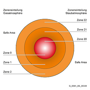 The local conditions must be subdivided into specified zones by the user with the assistance of the responsible authorities in accordance with the frequency of occurrence of an explosion hazard. Device (equipment) categories are assigned to these zones. The zones are then subdivided into possible types of protection and therefore into possible equipment (product) types.