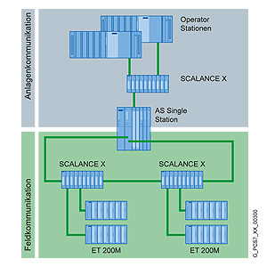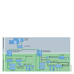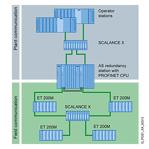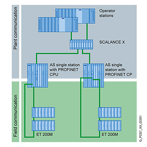 Базируется на линейной, звездной, древовидной и кольцевой топологиях, многочисленные сетевые конфигурации могут быть выполнены с PROFINET IO для полевых коммуникаций SIMATIC PCS 7 process control system. Станции удаленного ввода-вывода могут быть подсоединены напрямую через интерфейсный модуль IM 153 4 PN High Feature или при помощи коммутаторов SCALANCE X. Имеются различные конфигурационные опции, в зависимости от использования AS одиночных станций или AS резервированных станций. Следующие примеры конфигураций могут быть также применены для коммуникаций систем безопасности PROFINET IO (для дальнейшей информации см. раздел "Интегрированная безопасность для процессов автоматизации ", глава "Введение").