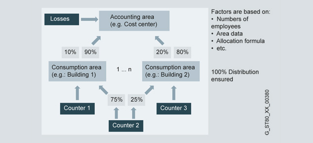 Вычисление и назначение/распределение энергетических затрат по МВЗ (местам возникновения затрат) и/или заказчикам/ элементам затрат в соответствии с принципом затрата-причина. Поддерживаются восходящие (измерение) и нисходящие (назначения) процедуры.