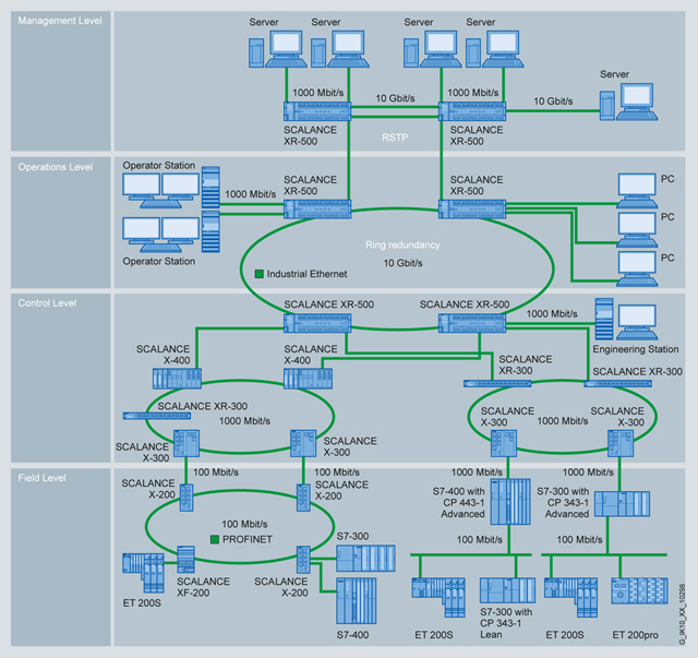 Использование коммутатора SCALANCE X-500 в резервированных сетевых топологиях. Например, с поддержкой процедур Rapid Spanning Tree Protocol (RSTP) и использованием кольцевых сетей