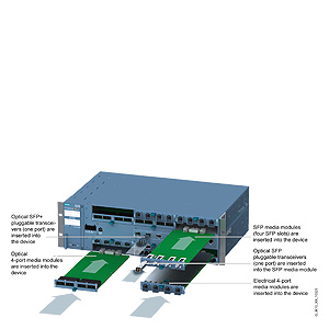 Съемные приемопередатчики SFP (Small Form-factor Pluggable) могут устанавливаться в интерфейсный субмодуль MM992-4SFP или во встроенные слоты SFP+ базового блока коммутатора SCALANCE X-500.
