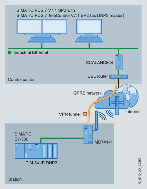 Станция подключается через GSM с поддержкой сервисов GPRS. При использовании на станции GPRS маршрутизатора MD741-1 и модуля SCALANCE S в центре управления появляется возможность установки VPN соединений между центром управления и GPRS станциями.
