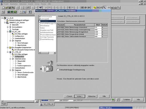 Это программное обеспечение может работать как автономное приложение для ПК либо быть встроено в систему SCOUT (с SIMOTION) или STEP 7 (сDrive ES Basic). Основные функции и управляемость в обоих случаях одинаковы. В дополнение к SINAMICS DC MASTER, текущая версия STARTER также поддерживает все приводы переменного тока SINAMICS - включая MICROMASTER 4 и преобразователь частоты для SIMATIC ET 200S FC распределенного ввода/вывода. SINAMICS DC MASTER поддерживается STARTER 4.1.5; использование старых версий STARTER невозможно. Мастер проекта может быть использован для создания приводов в единой структуре проектного дерева. Для новичков процесс выбора в диалоговом меню, ориентированном на решение именно данной задачи, будет простым, а графическое отображение обеспечивает максимальную ясность при установке параметров привода. Первый запуск может быть выполнен с помощью мастера, который сам сделает все минимально необходимые настройки. Привод будет способен работать после ввода минимального числа параметров. Пример индивидуальных настроек может включать определение: