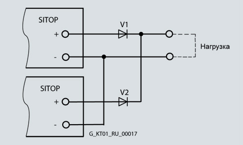 Два источника питания SITOP одного и того же типа могут быть соединены параллельно через диоды (V1, V2 на рисунке) для достижения резервирования. 100% резервирование с двумя источниками питания SITOP существует только когда полный ток нагрузки не превышает тока нагрузки который может обеспечить один источник питания SITOP и источник питания на входной стороне тоже сконфигурирован с избыточностью. То есть, в случае короткого замыкания в первичной сети источника питания не должно быть общих предохранителей отключающих оба источника от системы электропитания.