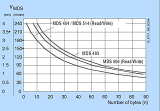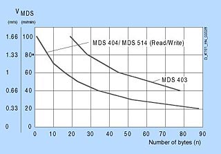 M: Центр окна передачи Sa: Рабочее расстояние Sg: Предельное расстояние (максимальное расстояние прямой видимости между верхней поверхностью устройства записи/чтения и верхней поверхностью мобильного накопителя данных, на котором передача все еще может функционировать при нормальных условиях) L: Длина окна передачи для вертикального перемещения мобильного накопителя данных 2L: Длина окна передачи для горизонтального перемещения мобильного накопителя данных TG: мертвая зона между двумя окнами передачи. В этой зоне обработка мобильного накопителя данных невозможна. Мертвая зона имеет длину несколько мм. Во всех последующих анализах мертвая зона считается пренебрежимо малой (TG = 0 мм) Диаграмма зависимости скорости от объма данныхПоказанные здесь кривые предназначены для того, чтобы помочь в выборе мобильных накопителей данных и устройств записи/чтения для MOBY I для динамических приложений. Эти кривые пригодны для вертикального режима с однократной длиной окна передачи (L) и рабочим расстоянием (Sa).