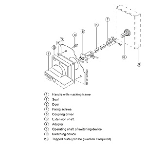 УстройсвоПоворотный механизм состоит: из самой ручки, накладлной панели, для установки на дверь шкафа, соединительного вала (300 мм) и втулок для его крепления и механизма выключателя. Поворотный механизм для выключателей 3KA/3KL/3KM не имеет соеденительной муфты вала так как вал входит непосредственно в механизм выключателя . Соеденилельные валы длинной 600 мм, так же доступны для заказа. Проект, схематическое представление