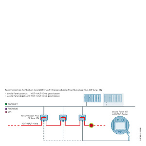 Если мобильная панель с кнопкой STOP используется вместе с соединительными коробками версии "Plus", возможна конфигурация в которой сочетается гибкое использование мобильной панели и интеграции ее в цепь экстренного останова оборудования. Цепь экстренного останова остается сомкнутой независимо от того подключена мобильная панель к соединительной коробке или нет. Когда мобильная панель подключена, она включается в цепь экстроенного останова и при нажатии  кнопки STOP цепь разомкнется с вызовом функции останова. Если мобильная панель отключается во время работы, цепь экстренного останова в версии "Plus" соединительной коробки автоматически смыкается (пример конфигурации: Mobile Panel 177).