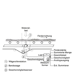Ленточные весы Siemens Milltronics измеряют только вертикальную составляющую силы веса. Материал передвигается вниз по конвеерной ленте и, проходя через конвеерные весы, оказывает силу, пропорциональную нагрузке материала, которая оказывается на роликовые опоры. Результирующее усилие, приложенное к каждой весоизмерительной ячейки, передается на тензорезисторы. Когда на тензорезисторы подается напряжение питания от электронного интегратора, приложенное усилие преобразуется в электрический сигнал, который передается интегратору. Отклонение весоизмерительных ячеек в вертикальном перемещении ограничиваются упором, встроенного в ленточные весы или весоизмерительную ячейку. Упоры защищают весоизмерительные ячейки от повреждения при высоких перегрузках.