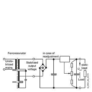 Магнитные стабилизаторы напряженияПринципиальная схема магнитного стабилизаторы напряжения Магнитные стабилизаторы состоят из ферромагнитного резонатора и дополнительного регулирующего блока. Ферромагнитный резонатор обеспечивает достаточно высокую точность стабилизации своего выходного напряжения переменного тока. Его входная и резонансная обмотки магнитного стабилизатора разделены большим воздушным зазором. Рабочей зоной резонатора является зона насыщения стали сердечника. Для повышения точности стабилизации выходного напряжения к выходу ферромагнитного резонатора достаточно часто подключают стабилизатор последовательного типа или импульсный стабилизатор с коммутацией на вторичной стороне. Магнитные стабилизаторы отличаются высокой надежностью, однако имеют относительно большие массогабаритные показатели и высокую стоимость. Преимущества: