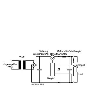 Импульсные стабилизаторы с коммутацией на вторичной стороне:Принципиальная схема импульсного стабилизатора с коммутацией на вторичной стороне Гальваническое разделение с питающей сетью обеспечивается применением 50 или 60 Гц трансформатора. После выпрямления и сглаживания напряжение подается на выходную цепь фильтрации и накопления через транзисторный ключ, работающий в импульсном режиме. Входной трансформатор обладает свойствами фильтра, поэтому блок питания практически не оказывает влияния на работу питающей сети. КПД такого стабилизатора очень высок. Конструкция стабилизатора имеет множество преимуществ и позволяет создавать блоки питания с несколькими уровнями стабилизированных выходных напряжений. В импульсных стабилизаторах с коммутацией на вторичной стороне необходимо предпринимать меры для защиты нагрузки, поскольку при пробое транзисторного ключа к нагрузке может быть приложено нестабильное напряжение сглаживающего конденсатора. Подобная проблема существует и в стабилизаторах последовательного типа. Преимущества: