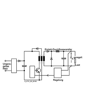 Импульсные стабилизаторы с коммутацией на первичной стороне:Для построения импульсных стабилизаторов с коммутацией на первичной стороне может использоваться большое количество схемотехнических решений. Хорошо известны схемы на основе 1- и 2-тактных, блокирующих, полумостовых и мостовых, а также резонансных преобразователей. Принцип действия импульсных стабилизаторов с коммутацией на первичной стороне будет рассмотрен на примере схемы с 1-тактным преобразователем. Принципиальная схема 1-тактного преобразователя Входное напряжение сети сначала выпрямляется и сглаживается. Емкость конденсатора в промежуточном контуре определяет допустимое время исчезновения входного напряжения. При входном напряжении ~230 В напряжение на промежуточном контуре составляет =320 В. Это напряжение подается на вход 1-тактного преобразователя, который использует высокочастотную широтно-импульсную модуляцию для передачи электроэнергии через импульсный трансформатор. Коммутирующий транзистор работает в ключевом режиме. Потери мощности на нем незначительны. В зависимости от величины выходного напряжения и тока нагрузки КПД стабилизатора может находиться в пределах от 70 до 90%. Импульсный трансформатор работает на высокой частоте, поэтому его размеры достаточно малы. Увеличение частоты ведет к уменьшению габаритов импульсного трансформатора, но увеличивает потери на коммутацию, поэтому данный параметр должен выбираться с учетом обеспечения требуемого значения КПД. В подавляющем большинстве импульсных преобразователей в зависимости от их выходной мощности используются тактовые частоты в диапазоне от 20 до 250 кГц. Напряжение вторичной обмотки импульсного трансформатора выпрямляется, фильтруется и сглаживается. Отклонение Uвых от заданного значения передается через оптрон в первичную цепь. Через широтно-импульсный регулятор (проводящая фаза коммутирующего транзистора в первичном контуре) необходимая энергия передается во вторичную цепь, стабилизируя выходное напряжение. Во время непроводящей фазы коммутирующего транзистора трансформатор через вспомогательную обмотку снова размагничивается. Максимальная скважность импульсов в этих схемах не превышает 50%. Преимущества: