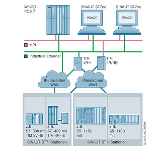 Программное обеспечение SINAUT ST7cc базируется на функциональных возможностях пакета SIMATIC WinCC и является идеальной основой для построения компьютерных центров управления в системах SINAUT ST7 и SINAUT ST1. Оно разработано для событийно управляемого обмена данными в системах SINAUT с присвоением телеграммам отметок даты и времени. Это исключает возможность потери данных, свойственных циклическому опросу в WinCC. Наличие отметок даты и времени позволяет выполнять архивирование данных и анализ различных событий в их хронологическом порядке. Область отображения процесса SINAUT ST7cc содержит все данные процесса и состояния всех SINAUT станций в сети. ST7cc предоставляет эти данные в распоряжение WinCCдля их быстрой визуализации. ST7ccConfig поддерживает широкий спектр функций конфигурирования систем связи, используемых для передачи телеграмм, формируемых терминальными устройствами SINAUT ST7 и SINAUT ST1. Переменные WinCC формируются автоматически, модифицируются в событийном порядке и позволяют отображать любые изменения в системе. Для архивирования и протоколирования данных, а также для формирования отчетов в соответствии с требованиями ATV Notice H260 или Hirthammer рекомендуется использовать дополнительные пакеты WinCC/PM-AQUA или WinCC/ACRON. ST7cc содержит конфигурируемый интерфейс обмена данными с этими пакетами. Дополнительное применение пакета WinCC/Redundancy позволяет создавать резервированные компьютерные центры управления. |