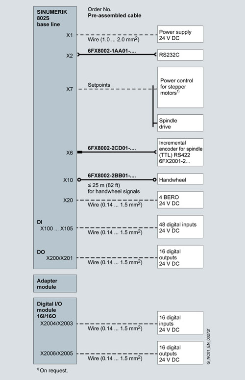 Обзор подключений для SINUMERIK 802S base line Обратите внимание на максимально допустимую длину кабеля (например, ≤ 25 м (82 фута)). Использование более длинных кабелей может привести к выходу из строя.