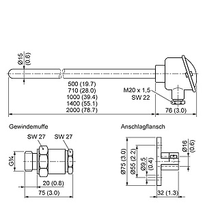 Термометр сопротивления для дымового газа с соединительной головкой, размеры в мм (дюймах) |