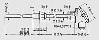 Ввинчивающийся термометр сопротивления низкого давления с соединительной головкой и консолью, размеры в мм (дуймах) |