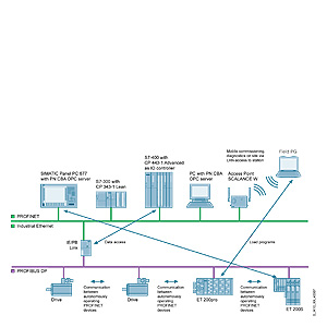Пример PROFINET конфигурации с Industrial Ethernet и PROFIBUS. Через IE/PB Link PN IO в качестве proxy, PROFIBUS приборы интегрируются вPROFINET.