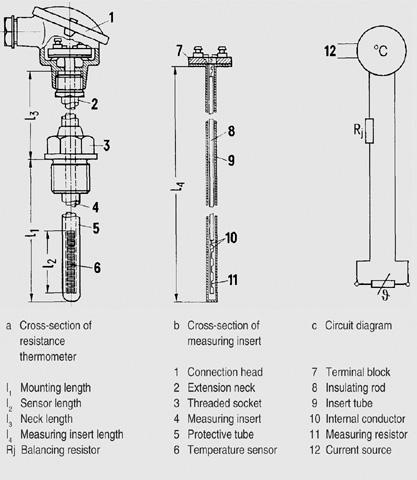 Составные части и подключение термометра сопротивления Для лучшей защиты и быстрой замены измерительного резистра для рабочих измерений он крепится в измерительной вставке (4), которая в свою очередь вставляется в защитную трубку (5). Измерительная вставка крепится двумя винтами пружинно в соединительной головке защитной арматуры (1). Внутреняя линия (10) в измерительной вставке соединяет измерительный резистр (11) с клеммами на соединительном цоколе. В зависимости от диапазона измерения и требований к точности измерения термометры подсоединяются к выдающим устройствам по двух-, трех- или четырехпроводной схеме. Для этого могут поставляться измерительные вставки с двумя, тремя или четырьмя внутренними линиями. При пренебрежительно малом сопротивлении внутренней линии этом возможно использование измерительных вставок с двумя внутренними линиями в трех- и четырехпроводных схемах. Точная компенсация внутренней линии в рабочем состоянии возможна только при трех внутренних линиях. При внутреннем сопротивлении линии выше 0,2 Ω его величина указывается на крепежном фланце измерительной вставки.