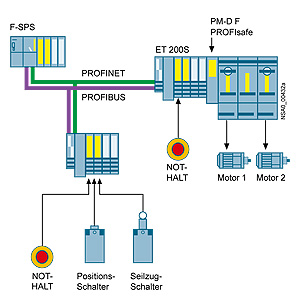 В системах, поддерживающих функции экстренного отключения питания, селективное отключение F-модулей фидеров нагрузки выполняет вышестоящий модуль контроля питания PM-D F PROFIsafe. Для каждого F-модуля фидера нагрузки может быть сформировано 6 групп отключения. Интерфейс связи с датчиками F-системы образуют F-контроллеры SIMATIC. Интерфейс между PROFIsafe и установками с системами безопасности поддерживается через модуль умножителя контактов F-CM с четырьмя выходными контактами.