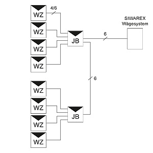 Распределительная коробка из литого под давлением алюминия состоит из нижней части и крышки. Корпус защищен от проникновения пыли и брызгов воды, степень защиты IP66. Кабели вводятся через метрические резьбовые зажимы. В корпусе имеется 28 клемм с пружинными контактами. Благодаря технологии пружинных зажимов получается вибростойкое и не требующее обслуживания соединение. Внутреннее сопротивление, показатель и номинальная нагрузка всех включенных параллельно весоизмерительных ячеек должны быть одинаковыми. Распределительная коробка не накладывает ограничений на величину этих значений. Весоизмерительные ячейки можно подключать по четырех- или шестипроводной технологии. Если используется четырехпроводная технология, необходимо установить две дополнительные перемычки. Примеры подключения4 весоизмерительные ячейкиWZ: Весоизмерительная ячейка JB: алюминиевая распределительная коробка 8 весоизмерительные ячейкиWZ: Весоизмерительная ячейка JB: алюминиевая распределительная коробка