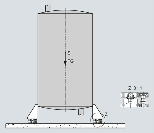 Пример 1: взвешивание емкостейЦентр тяжести S стоячей емкости находится над уровнем измерительных ячеек. Она опирается на 4 лапки (требование производителя емкости), в порожнем состоянии (собственный вес) весит 1,2 т, максимальная емкость 1,8 т. Нагрузка равномерно распределяется по 4 весоизмерительным ячейкам. Весы эксплуатируются на защищенном участке. ПримечаниеТрехточечная опора емкости статически однозначна и обеспечивает стабильное состояние (см. примечание в Введении). Выбор весоизмерительных ячеек и монтажных компонентовКак было сказано вначале, номинальная нагрузка была определена в 1 т. Емкость на измерительных ячейках серии RN и комбинированных монтажных блоках Для вышеприведенного примера были выбраны 4 ячейки SIWAREX R серии RN с номинальной нагрузкой 1 т, т.к. высокоточные ячейки RN имеют достаточно небольшую высоту. В качестве монтажных компонентов используются самоцентрирующиеся комбинированные блоки, которые помимо качания и его ограничения не дают конструкции двигаться вверх по вертикали. Стопор подъема рассчитан на максимальную вертикальную силу в 10 кН. Если подъемная сила больше этого значения (например, из за ветровой нагрузки), емкость следует зафиксировать дополнительными аварийными устройствами. Конфигурация для взвешивания емкостей (базовая)