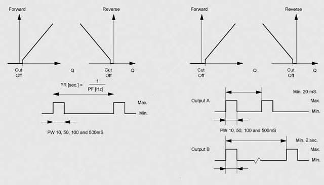 Выход A и B как импульсный объем: при конфигурировании выход A/B на объем на импульс выход подает импульс , как только предустановленный объем прошел выбранное направление, вычисление по расходу вперед/назад или нетто-вперёд/нетто-назад. Объем на импульс может свободно масштабироваться от 0,0001 до 10.000 счетных единиц на импульс. PR = частота повторения импульсов и PF = частота импульсов