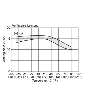 Влияние других значений температуры показано на рисунке. Изменение температуры с 15 до 55 °C уменьшает емкость на 17%. (в таблице с 15 Ah до 12,5 Ah).