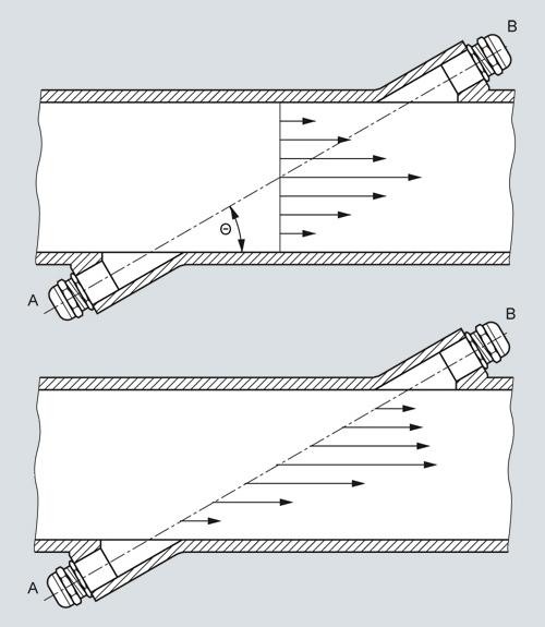 Прямая обработка сигналаВ программе ультразвукового расходомера сигнал посылается напрямую, без отражени от стенки, от измерительного преобразователя на приёмник. Отправка сигнала от точки к точке позволяет достичь очень хорошей силы сигнала при обработке и тем самым избежать внезапных остановок расходомера. Физический принципРаспределение скорости вдоль звукового тракта Перемещающаяся в одном направлении с жидкостью от точки А звуковая волна достигает точки В быстрее, чем звуковая волна, движущаяся против направления потока от точки В к А. Разница в скорости распространения звука показывает скорость потока в трубе. Так как время задержки измеряется за короткие интервалы как по, так и против напрвления потока, то вязкость и температура не влияют на точность измерения. Принцип измеренияВ расходомерах SITRANS F US SONOFLO оба ультрозвуковых акустических преобразователя располагаются под услом по отношению к оси трубы.Акустические преобразователи работают как измерительные преобразователи и приёмники ультразвуковых сигналов. Для измерения определяется время, которое ультразвуковой сигнал затрачивает при перемещении по и против потока. Принцип может быть выражен следующим образом: v = K · (tA,B – tB,A) / (tA,B · tB,A) = K · Δt/t² v = средняя скорость потока Преимуществом этого принципа измерения является независимость от колебаний фактической скорости звука жидкости и тем самым от температуры. Пропорциональный коэффициент К определяется при проливке. Ультразвуковое измерение потока через батареюSiemens предлагает решение расхода с батарейным питанием и литеевой батареей 3,6 V cо сроком службы до 8 лет. Так как электроника была оптимизирована на очень низкий потребляемая мощность, электронные функции и сервисные возможности доступны тоько в ограниченном объёме. Работающие от батареи ультразвуковые расходомеры используются при производстве энергии, на предприятиях обеспечения и ирригационных установках главным образом там, где подключение к магистральной сети невозможно. Геометрия трубы с двухтрековой конструкциейCтатическая или механическая точность всех расходомеров зависит от геометрии трубы до и после расходомера, а также количества ультразвуковых измерительных треков. При протоку воды через трубы она, в зависимости от формы трубы, имеет тенденцию к завихрению или протоку внутри трубы с различной скоростью. Поэтому сегодня 2 или более треков являются наиболее современной технологией. Преимущества 2-трековой системы: