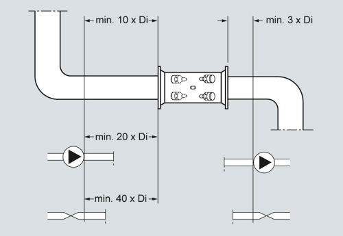 Впуск и выпускРекомендуемые прямые участки Для достижения наилучшей производительности впуски и выпуски должны быть прямыми. Необходимо соблюдать определенное расстояние между расходомером и изгибами, насосами и вентилями. Кроме этого расходомер должен располагать по центру относительно трубного фланца и уплотнений. Вентили всегда должны устанавливаться за расходомером. Это не относится только к установке измерительного датчика в вертикальную трубу. В этом случае для установки нулевой точки необходимо предусмотреть вентиль под измерительным датчиком. При этом выбрать такой вентиль, который в полностью открытом состоянии не вызывает изменения потока.