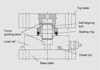 Качающаяся опора состоит из подвижной стойки, головной плиты (верхняя часть опоры) и плиты основания (нижняя часть опоры). Самоцентрирующаяся подвижная опора позволяет головной плите и, соответственно, несущей конструкции следовать горизонтальным отклонениям (например, при колебаниях температуры). Конструкция стойки создает противодействующую силу, которая зависит от величины отклонения и приложенной нагрузки. Весоизмерительная ячейка не входит в объем поставки. Принципиальная схема Качающаяся опора для весоизмерительных ячеек серии RN |