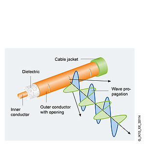 RCoax - это коаксиальный кабель с тщательно нанесенными отверстиями на внешнем проводнике. Через эти отверстия по всей длине кабеля обеспечивается свободное распространение радиоволн в обоих направлениях. Расстояние между подвижным прибором и RCoax кабелем может колебаться в пределах от нескольких сантиметров (например, в монорельсовых конвейерах) до 10 м (например, в каналах и туннелях). Реальные отклонения движущихся приборов от указанных расстояний могут изменяться в пределах от 50% до 200%. Например, при типовом удалении от RCoax кабеля в 10 см, прибор может перемещаться в зонах от 5 до 20 см от кабеля. Условия обмена данными и монтажа могут быть оптимизированы за счет использования кабелей различных типов на сетевых станциях. Одна точка доступа на основе модуля SCALANCE W 788-1pro может комплектоваться кабелем длиной до 200 м. (Замечание: процесс затухания сигнала в кабеле аналогичен затуханию сигналов в воздухе, поэтому точки доступа должны размещаться равномерно вдоль зоны радио охвата). Если точка доступа размещается в середине 200 м сегмента, то она сможет обеспечивать связь на 100 м вправо и на 100 м влево от себя. Сегменты RCoax кабеля могут связываться между собой или монтироваться с разрывами. Во время движения мобильные станции автоматически переключаются с одной точки доступа на другую в соответствии с принципами работы радиосетей WLAN без перерывов в обмене данными. Мобильные станции комплектуются модулями SCALANCE W 744-1pro, который обеспечивает возможность обмена данными с точками доступа в диапазонах частот 2.4 ГГц (IEEE 802.11b/g) и 5 ГГц (IEEE 802.11a) со скоростью до 54 Мбит/с. RCoax кабель выпускается в химически стойкой оболочке, не содержит галогенов и кремния, способен работать в диапазоне температур от -40 до +85°C, что существенно расширяет сферы возможного применения беспроводных систем связи. |