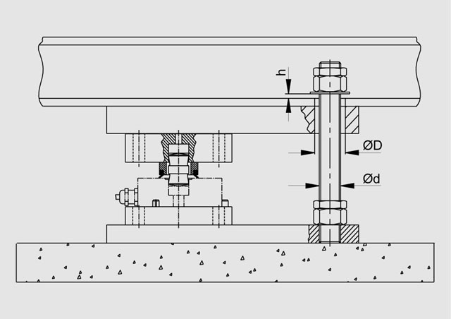 Ограничитель качания может быть выполнен в виде стойки, центрированной в отверстии большего размера. На принципиальной схеме в узел дополнительно интегрирован стопор подъема, ограничивающий перемещение несущей конструкции вверх. Принципиальная схема Принципиальная схема внешнего ограничителя качания со стопором подъема |