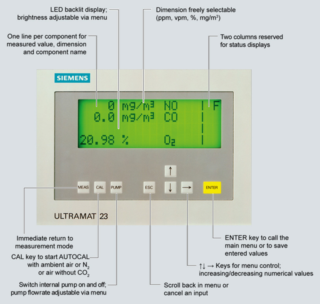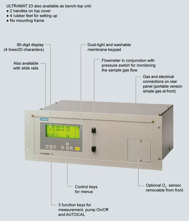 ULTRAMAT 23, портативный, в корпусе из листовой стали с внутренним насосом газа-пробы, конденсационная ловушка с защитным фильтром на лицевой панели, опциональное измерение кислорода