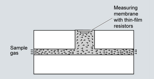 Mode of operationThe measuring principle is based on the different thermal conductivity of gases. The CALOMAT 6 sensor is a micromechanical-made Si chip with a measuring membrane and thin-film resistors. The resistors are adjusted on a constant temperature. This requires an current intensity depending on the sample gas thermal conductivity. Further this „coarse value“ is electronically processed and used to calculate the gas concentration. The sensor is located in a thermostatically-controlled stainless steel enclosure in order to prevent influences of ambient temperature changes. To prevent the influences by the sample gas flow changes, the sensor is not placed in the main flow. Note The sample gas needs to be free of dust. Condensate (dew point of sample gas < ambient temperature) in the cells must be avoided. That is why the most measuring tasks require an appropriate gas preparation. CALOMAT 6, mode of operation Special characteristics