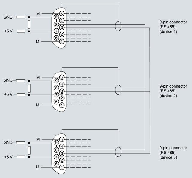 Bus terminating resistorsThe pin 3-7 and 8-9 of the first and last connector of a bus cable have to be bridged (see figure). Note It is advisable to install a repeater on the device side in case of a cable length increasing 500 m or of high interferences. Up to four components can be corrected via ELAN bus, a cross correction can be effected for up to two components via analog inlet. Bus cable with connector assignments |