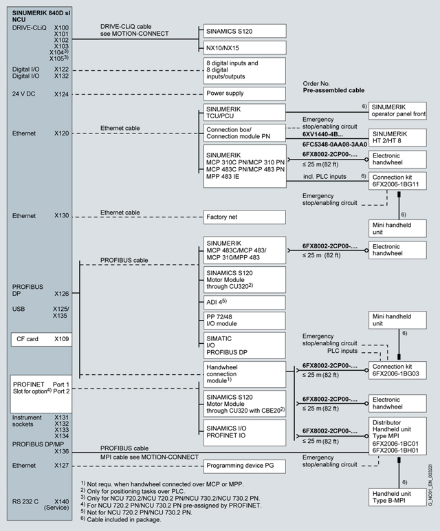 Обзор подключения дляSINUMERIK 840Dsl Необходимо учитывать максимально допустимые длины кабелей (например, ≤ 25 м/82 фута). При использовании большей длины могут возникнуть неисправности.