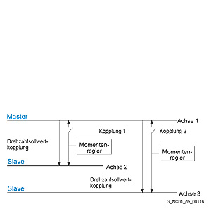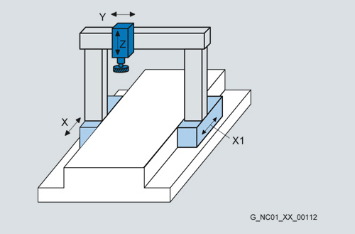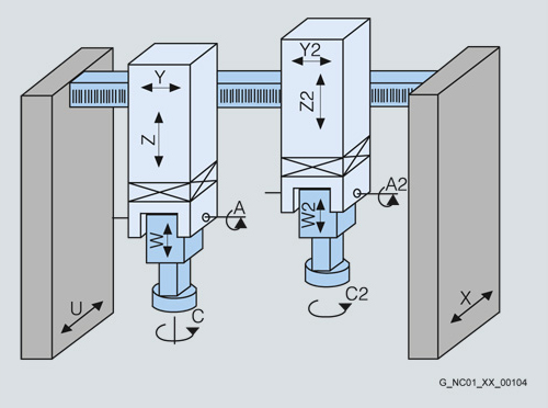 Существуют оси-Master и оси-Slave. Ось-Master может вести несколько Slave-осей, одна ось-Slave не может быть одновременно Master-осью (каскадирование не возможно). Чтобы защитить обрабатывающие головки от столкновения, можно установить защиту от столкновения и активировать ее, на выбор, через параметр станка или интерфейс VDI.