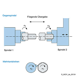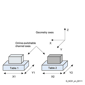 Замена оси/шпинделя axis/a шпиндель надолго назначен на определенный канал через машинные данные. Функция замены оси/шпинделя может использоваться, чтобы выпустить axis/a шпиндель (ВЫПУСК), и назначать это на другой канал (ДОБИРАЮТСЯ), то есть, чтобы заменить ось/шпиндель. Соответствующие топоры/шпиндели определены через машинные данные.