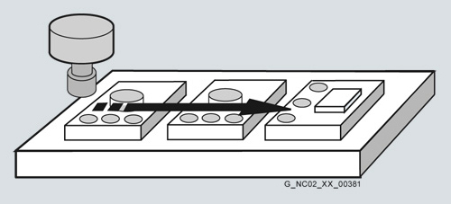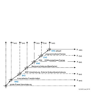 Программируемые смещения нулевой точки: С помощью TRANS (замещающая функция, база G54 … G599) или АTRANS (аддитивная функция) могут программироваться смещения нулевой точки. Таким образом, например, при повторяющихся проходах обработки на различных позициях детали Вы можете работать с переменными смещениями нулевой точки. Через G58/G59 прежде запрограммированные смещения нулевой точки аксиально заменяемы.