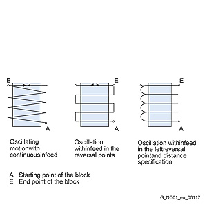 Когда ось, определенная как ведущая ось, перемещается, связанные оси (следящие оси) перемещаются по траектории, полученной от основной оси, с учетом коэффициента связи (связь по заданию). Совместно, ведущая ось и следящие оси формируют группу связанных осей. Определение и активация группы связанных осей имеют место одновременно с модальным - как команда TRAILON. Группа связанных осей может состоять из любых комбинаций линейных и круговых осей. В связанных осях может быть определено до двух ведущих осей (в различных группах связанных осей) одновременно. Моделируемая ось может также быть определена как ведущая ось, когда реальная ось фактически перемещается принимая во внимание коэффициент связи. Другое применение для связанных осей - использование двух групп связанных осей на станке с двух сторон заготовки.