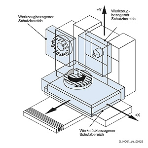 Активируемые и настраиваемые через установочные параметры нижние и верхние ограничения рабочей зоны могут быть изменены командами G25/G26. Ограничения рабочей зоны ограничивают область перемещения осей в дополнение к конечным выключателям. В рабочем пространстве станка устанавливаются защитные зоны, которые заблокированы для движений инструмента и защищают от повреждений такие узлы станка, как револьверную головку, измерительные станции и т. п.